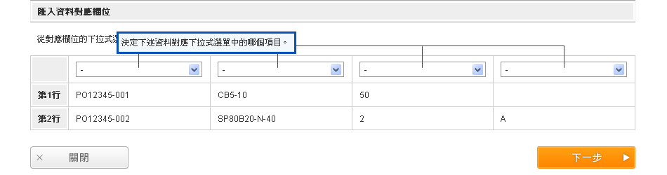 請利用下拉式選單來設定資料轉換的格式,選單下方的資訊為您欲上傳的檔案或複製的原始內容,請從每一列資訊上方的下拉式選單中,選擇該項內容的欄位名稱。 於下拉式選單中選取相符的欄位名後點選(下一步)。 您有選取欄位名稱的內容將會直接匯入輸入詢價內容畫面中。商品型號和數量爲必選欄位。您未選取欄位名稱的內容,將不會匯入輸入詢價內容畫面中。